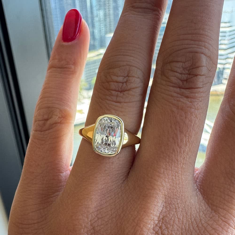The Elongated Cushion in Bezel Setting ring is a refined interpretation of classic romance where graceful form meets thoughtful design to create a truly unforgettable jewel. At its centre, the elongated cushion-cut diamond captivates with its soft, inviting glow and elongated silhouette that subtly elongates the finger, giving it an elegant, slender profile that feels both unique and timeless. This shape offers a brilliant balance of sparkle and depth, reflecting light with a warm, luminous radiance that speaks to quiet sophistication. All Temple and Grace jewellery is beautifully crafted to the highest standards and is made at our jewellery workshop directly by us (skilled jewellery craftsmen). This is why you can save over 40% when compared to high-street retail prices. We also offer a lifetime warranty and unmatched 100 day returns. You can shop online or book an appointment to visit our jewellery boutiques in Sydney, Melbourne, Brisbane, Perth and Adelaide.