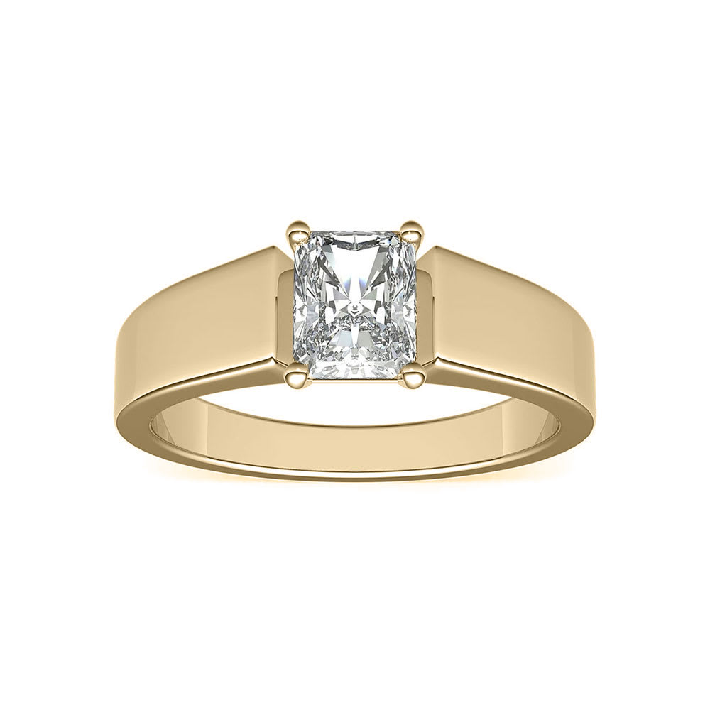 A bold and modern diamond engagement ring exudes sheer elegance and luxury. It features a certified 0.0.90carat radiant cut diamond held in four prongs and set on the wide lustrous gold shank. The classic pattern lends a distinctive appeal to this alluring band. The ring is available in 18K white, yellow, rose gold, and platinum 950. The jewellery is beautifully handmade to the highest standards. Shop directly from us and save over 40% when compared to high-street retail prices. We also offer unmatched 100 day returns. Buy online or book an appointment to visit our jewellery boutiques in Sydney and Melbourne.