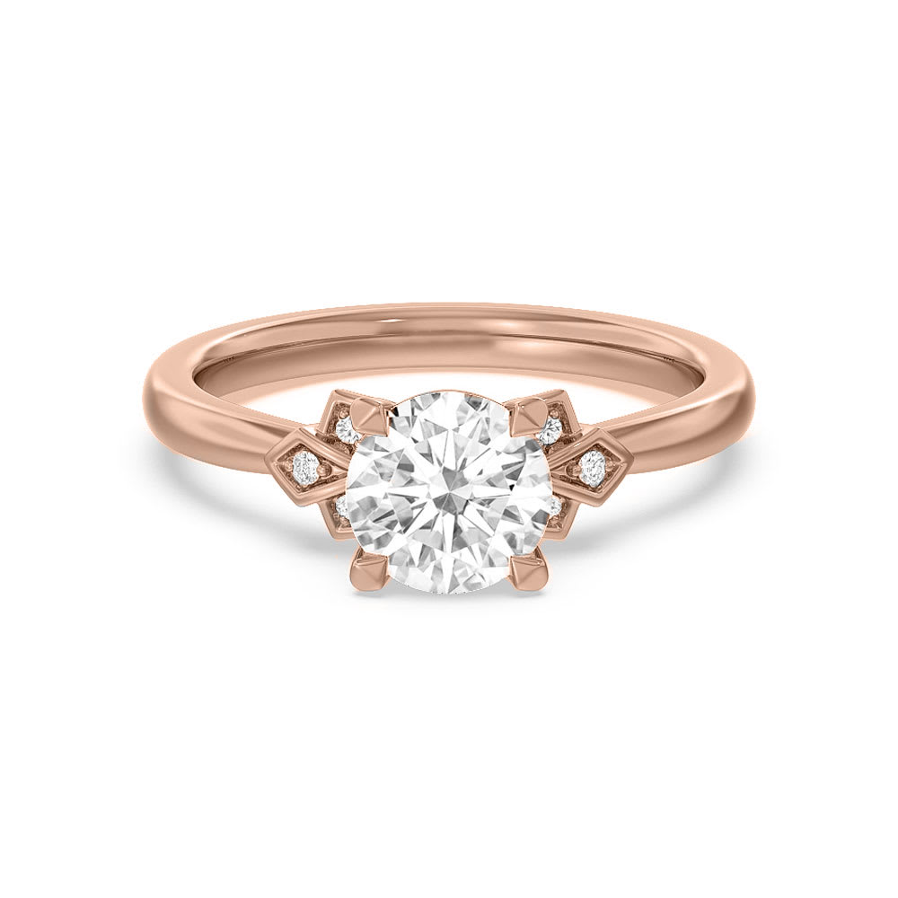 This womens engagement ring features a brilliant round lab diamond that is held in place by a claw setting, framed by round diamond side stones that are arranged in a kite leaf motif, adding a unique and eye catching element to the ring's design. The shank tapers slightly towards the centrepiece, adding a subtle but sophisticated flair. The kite leaf motif is a beautiful and sophisticated detail that gives the ring a sense of style and class. All Temple and Grace jewellery is beautifully crafted to the highest standards and is made at our jewellery workshop directly by us (skilled jewellery craftsmen). This is why you can save over 40% when compared to high-street retail prices. We also offer a lifetime warranty and unmatched 100 day returns. You can shop online or book an appointment to visit our jewellery boutiques in Sydney, Melbourne, Brisbane and Perth.