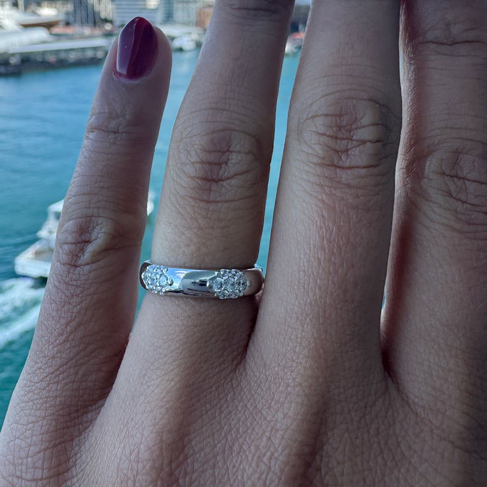 This wedding band embodies delicate sophistication its gently flowing form is quietly elegant, letting the diamonds do the talking. A continuous line of stones wraps around the band, each sparkles softly, creating a subtle yet steady shimmer that catches the light with every movement. The graceful simplicity of the design ensures the band feels timeless and refined, perfect for everyday wear as well as special occasions. With its understated brilliance, the band exudes quiet confidence and enduring charm a beautiful symbol of love and lifelong commitment. All Temple and Grace jewellery is beautifully crafted to the highest standards and is made at our jewellery workshop directly by us (skilled jewellery craftsmen). This is why you can save over 40% when compared to high-street retail prices. We also offer a lifetime warranty and unmatched 100 day returns. You can shop online or book an appointment to visit our jewellery boutiques in Sydney, Melbourne, Brisbane, Perth and Adelaide.