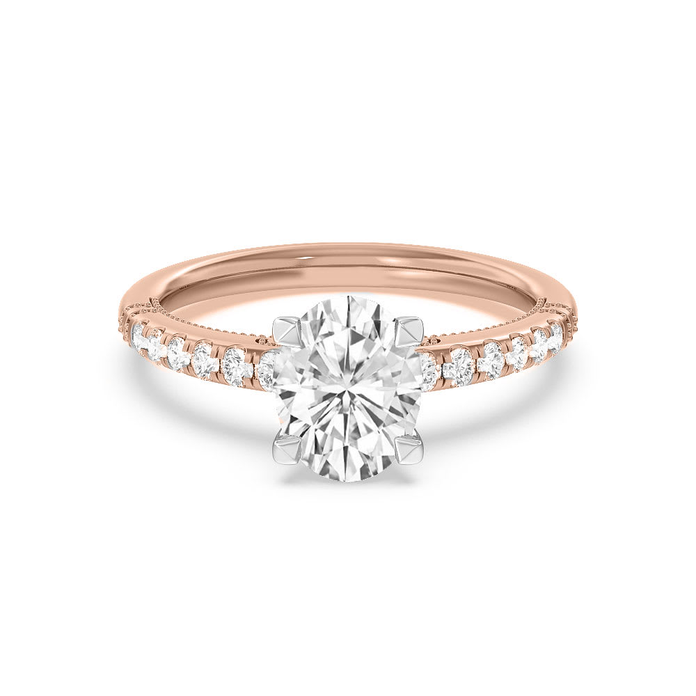 This women's engagement ring features lab grown an oval diamond set into four claw setting. It has designed with delicate milgrain scroll detailing on the side of the band. The scroll detail leads to a hidden diamond accent that complements the focal stone. The pave stones are set closely together to create a continuous line of sparkle that adds a luxurious and glamorous touch to the ring. All Temple and Grace jewellery is beautifully crafted to the highest standards and is made at our jewellery workshop directly by us (skilled jewellery craftsmen). This is why you can save over 40% when compared to high-street retail prices. We also offer a lifetime warranty and unmatched 100 day returns. You can shop online or book an appointment to visit our jewellery boutiques in Sydney, Melbourne, Brisbane and Perth.