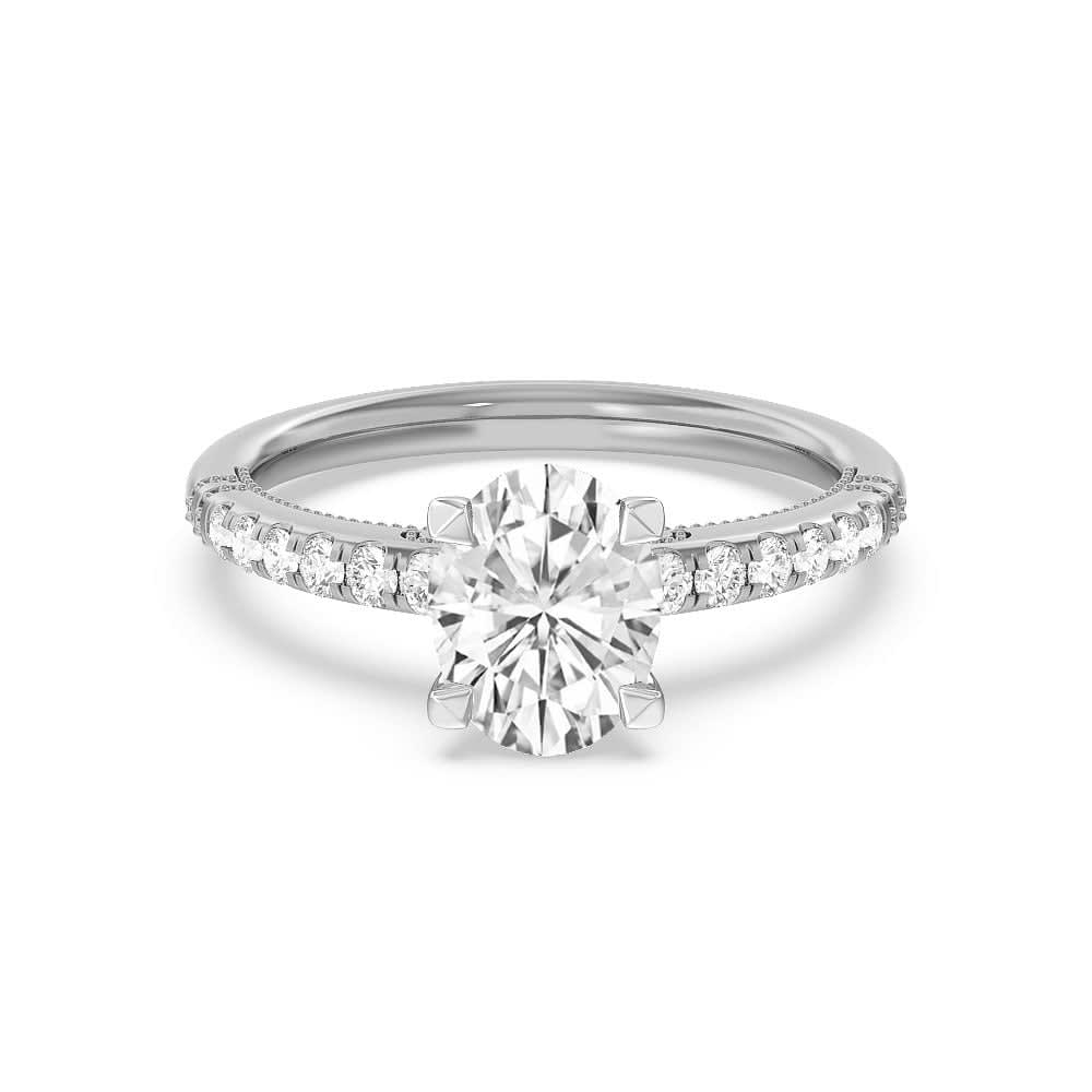 This women's engagement ring features lab grown an oval diamond set into four claw setting. It has designed with delicate milgrain scroll detailing on the side of the band. The scroll detail leads to a hidden diamond accent that complements the focal stone. The pave stones are set closely together to create a continuous line of sparkle that adds a luxurious and glamorous touch to the ring. All Temple and Grace jewellery is beautifully crafted to the highest standards and is made at our jewellery workshop directly by us (skilled jewellery craftsmen). This is why you can save over 40% when compared to high-street retail prices. We also offer a lifetime warranty and unmatched 100 day returns. You can shop online or book an appointment to visit our jewellery boutiques in Sydney, Melbourne, Brisbane and Perth.