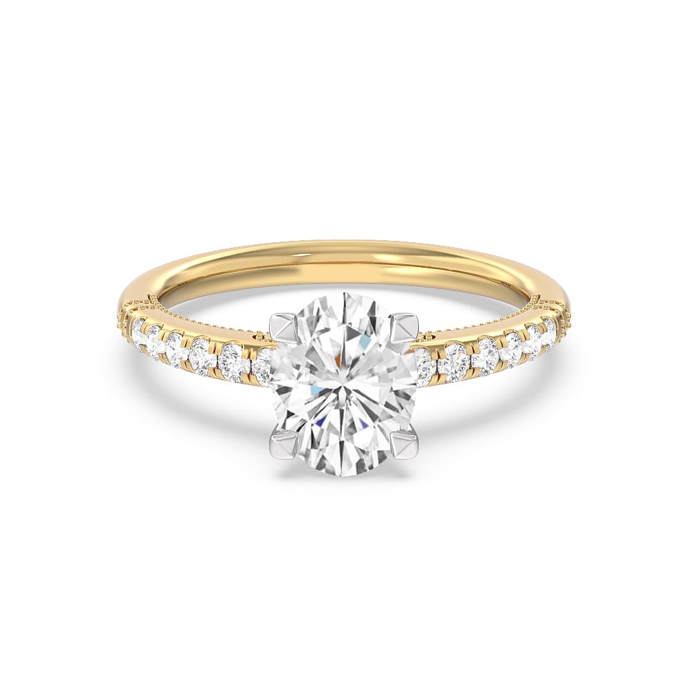 This women's engagement ring features lab grown an oval diamond set into four claw setting. It has designed with delicate milgrain scroll detailing on the side of the band. The scroll detail leads to a hidden diamond accent that complements the focal stone. The pave stones are set closely together to create a continuous line of sparkle that adds a luxurious and glamorous touch to the ring. All Temple and Grace jewellery is beautifully crafted to the highest standards and is made at our jewellery workshop directly by us (skilled jewellery craftsmen). This is why you can save over 40% when compared to high-street retail prices. We also offer a lifetime warranty and unmatched 100 day returns. You can shop online or book an appointment to visit our jewellery boutiques in Sydney, Melbourne, Brisbane and Perth.